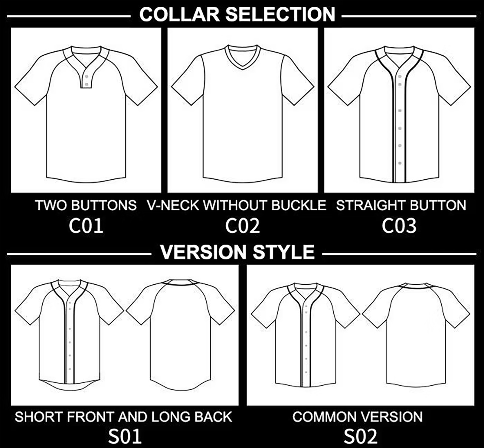 — Варианты бейсбольной формы: с коротким рукавом и без рукавов, с двумя пуговицами и с полной застежкой на пуговицах.
